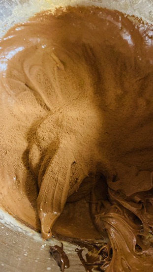 U smjesu dodati čokoladu i nastaviti miješati. Prosijati brašno i kakao u smjesu, što je jako bitno da ne ostanu grudice brašna ili kakaa u smjesi. Dio kad se dodaje brašno ne smije se premiksati. Preporučam da tek toliko na najslabije izmiksate suhe i mokre sastojke, a onda sa špahlom do kraja polako umiješate kako treba sve sastojke. Premiksavanje stvara više dojam kolača.