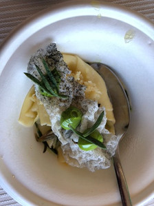 Zanimljiva kombinacija mediteranske i tajlandske hrane iskreno mi se svidjela. Amuse bouche od lubenice i kosanog lososa s malo kavijara bio je zanimljive teksture - i osvježavajuće, hrskavo, slano, slatko; serviran je uz čašu Tomić Opolo Nobile 2018. Kombinacija carpaccia od tune s ganacheom od guščje jetre je nešto što mi nikad ne bi palo na pamet i iznenađujuće dobro okusi se nadopunjuju. Carpaccio je serviran uz čašu Stine Vugave 2018. Jastog koji je priredila chefica Bee mi je bilo daleko najbolje jelo koje sam probala tijekom festivala (sve je zbilja bilo nevjerojatno ukusno) upravo zbog svježine umaka od limunske trave, limete, neizostavnog začina tajlandske kuhinje - riblji umak. Zezali smo se za stolom, gdje su sjedili gastro novinari iz različitih dijelova Europe, da su nam trebali dati i žlice za umak jer nam se svima jako svidio. Divan jastog je pariran uz čašu Vujnovićevoj Prča 2018. Paeneng curry je bio odličan. Goveđi obrazi koji su sporo kuhani 10 sati na 85º doslovno su se topili u ustima i curry zagrijali su svojom ljutinom sve prisutne jer je padanjem mraka postajalo dosta friško na Palmižani. Meni se jako svidio upravo zbog svoje ljutine, različitih divnih začina i samog mesa koje je bio divno, ali dosta posjetitelja (pogotovo Dalmatinaca) nije baš uživalo u ljutini ovog curryja. Žestinu curryja dobro je utažio Rizmanov Tribidrag 2016. Kad je došla hobotnica u prošeku chefa Hrvoja, kao da su svi malo odahnuli. Ukusni krak hobotnice u umaku od prošeka, koji je dosta podsjećao na umak od pašticade, uz rimski njok koji je rađen po recepturi bake chefa Zirojevića bio je izuzetno ukusan. Dok je došla hobotnica na red, ja više nisam mogla otvoriti usta. Naravno da sam ju probala i bila je izuzetno mekana i ukusna (razmišljala sam da otrčim do marine na drugu stranu otoka i nazad da se "oslobodi" još malo mjesta), ali čaša Stininog Plavca Majstora 2016 lako mi je tekla. Za desert su nam servirali cannoli punjen kremom od mascarponea i ricotte (koliko se sjećam), komadićima kandirane naranče i komadićima crne čokolade, na kremi od karamele. Kako dolikuje desertima, uz cannoli smo pili Tomićev prošek Petar Hektorovich 2016.